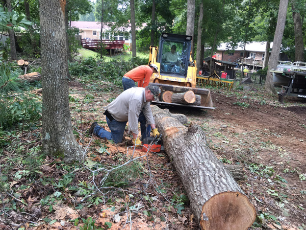 Strickland (kneeling) takes a chain saw to a fallen tree.