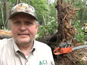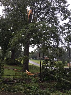 “We do get thunderstorms that last for 30 to 40 minutes but then they stop, but this storm had sustained winds of 40 to 60 mph that lasted for 24 hours and gusts that were estimated between 90 to 100 mph,” explains Strickland. “As the Oak trees were swaying in the wind their roots were slowly being lifted out and then rain water and mud would fill-in behind the roots. That process kept happening until the trees lifted themselves out of the ground.”