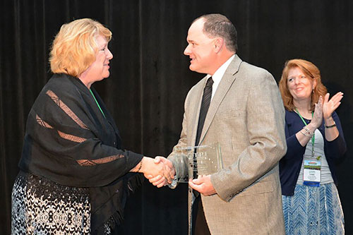 Dr. Clint Waltz accepts award from Linda Moyer, chair of TPI’s PR Working Group as TPI’s president, Linda Bradley looks on.